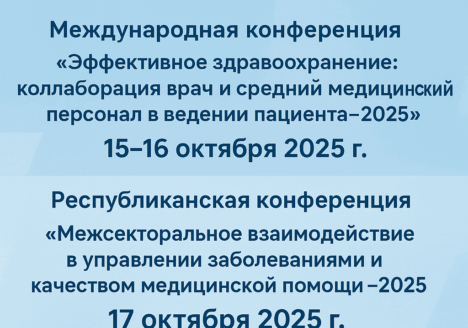 ОТКРЫВАЕМ РЕГИСТРАЦИЮ НА МЕЖДУНАРОДНУЮ КОНФРЕНЦИЮ «Эффективное здравоохранение: коллаборация врач и средний медицинский персонал в ведении пациента-2025» 15-16 октября 2025 г., а также на РЕСПУБЛИКАНСКУЮ КОНФРЕНЦИЮ «Межсекторальное взаимодействие в управлении заболеваниями и качеством…